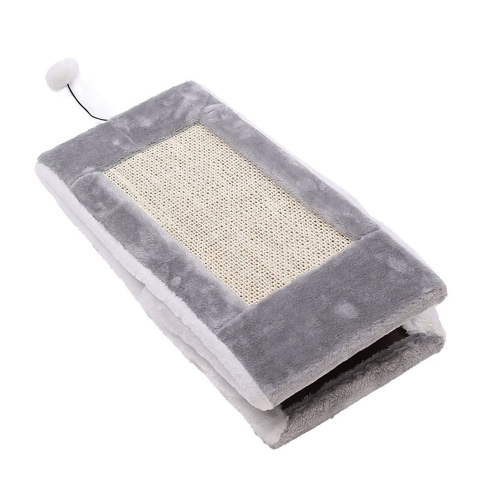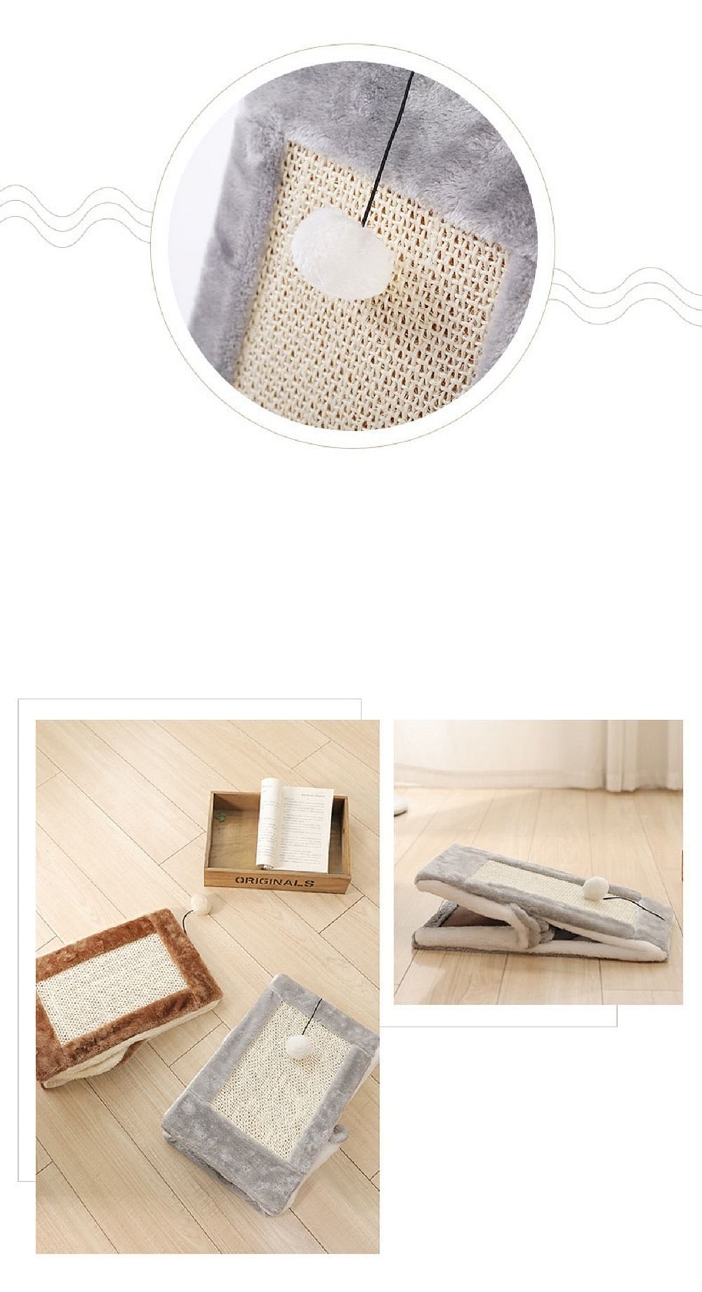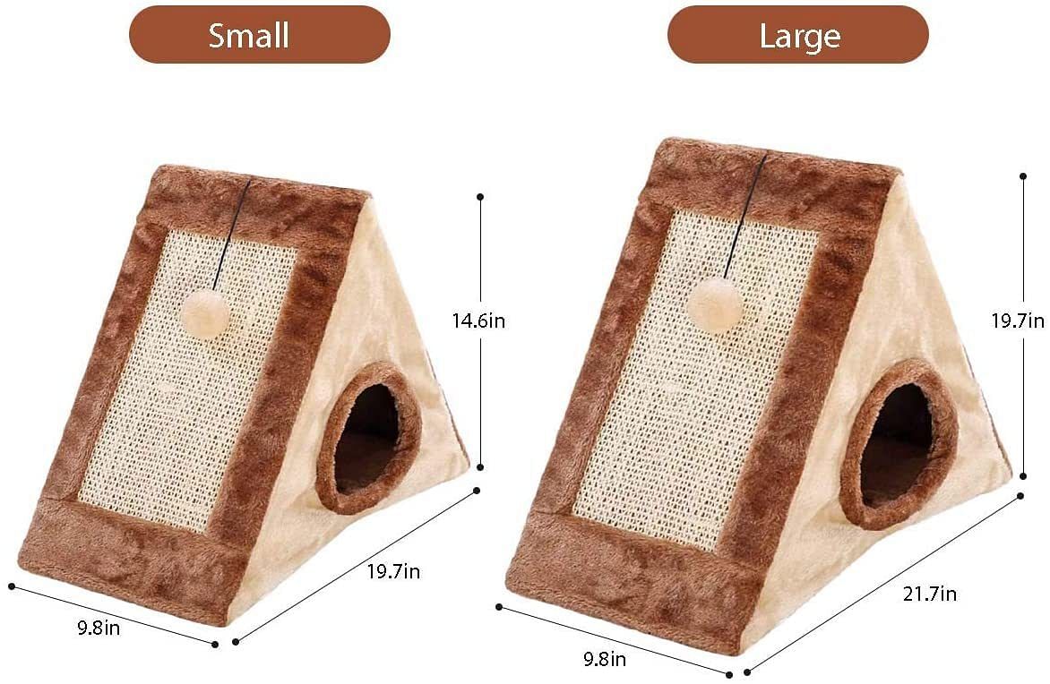 This foldable triangle cat scratcher provides a cozy hideaway, two sisal scratching surfaces, and a playful hanging toy. It’s perfect for travel, offers hours of entertainment, and helps protect furniture from scratches.